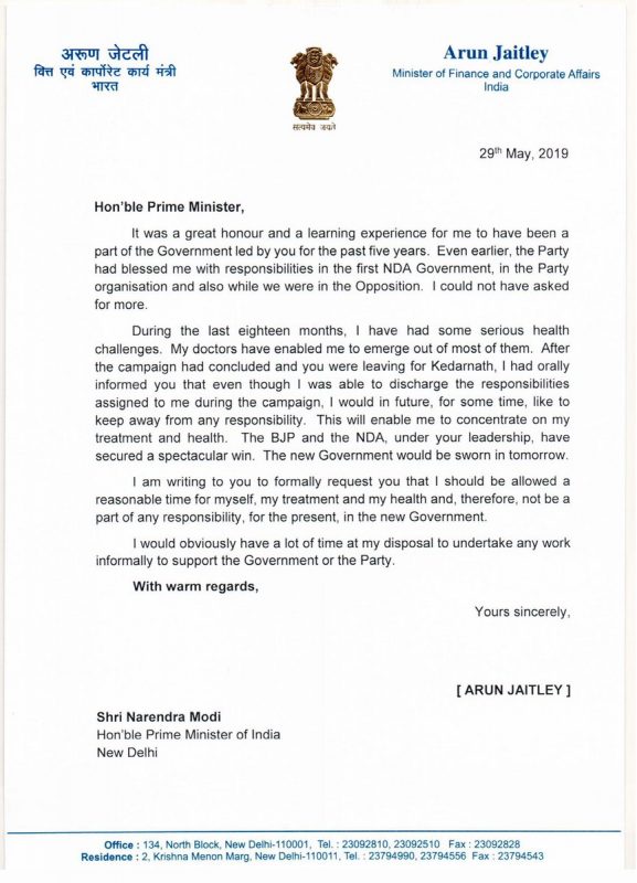 नईदिल्ली | मोदी सरकार में बित्त मंत्री रहे अरुण जेटली ने आज प्रधानमंत्री नरेंद्र मोदी को चिट्टी लिखी चिट्ठी में बित्त मंत्री अरुण जेटली ने लिखा के – पिछले पांच साल सरकार का हिस्सा रहना मेरे लिए गर्व और सीखने का अनुभव था। बीते 18 महीनों से गंभीर स्वास्थ्य समस्याओं से गुजर जूझ रहा हूं। हालांकि, मेरे डॉक्टरों ने ज्यादातर बीमारियों से निकलने में मदद की। आपके (मोदी) चुनाव अभियान के खत्म होने और केदारनाथ जाने से पहले मैंने मौखिक रूप से आपको बता दिया था कि नई सरकार में शामिल नहीं हो पाऊंगा। इसके बाद भी पार्टी और सरकार की अनौपचारिक मदद करता रहूंगा।’ अब देखना ये हैं की प्रधानमन्त्री मोदी किसे बित्त मंत्रालय का जिम्मा सौपते हैं जब अरुण जेटली की तबीतय खराब हुयी थी तब रेलमंत्री पियूष गोयल ने बजट पेश किया था इसलिए खबरे आ रही हैं की पियूष गोयल को बित्त मंत्री बनाया जा सकता हैं हलाकि इस दौड़ में और नाम हैं जो सामने आ रहे हैं. इनमें भाजपा अध्यक्ष अमित शाह का नाम भी शामिल है, दरअसल वित्त मंत्री के पद को सरकार में नंबर दो का पद माना जाता है. ऐसे में अगर अमित शाह सरकार का हिस्सा बनते हैं तो वह वित्त मंत्रालय या फिर गृह मंत्रालय ही संभाल सकते हैं.तीसरा नाम जो चर्चा में बना हुआ है वह निर्मला सीतारमण का. फिलहाल उनके पास रक्षा मंत्रालय था, ऐसे में अगर इस बार उनका मंत्रालय बदला जाता है तो वित्त मंत्रालय की जिम्मेदारी उन्हें मिल सकती है. इससे पहले मोदी सरकार के पहले कार्यकाल में उन्होंने कॉर्पोरेट मंत्रालय की जिम्मेदारी भी संभाली थी. ऐसे में उनके नाम को जोर मिलता दिख रहा है.