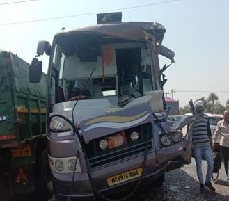 देवास | देवास जिले के नेमावर थाना अंतर्गत एक बस और डम्पर की आपस में टक्कर हो गयी इस टक्कर में बस में सवार 10 लोग घायल हो गए | घटना की जानकारी लगने पर पुलिस की डायल-100 और 108 घटना स्थल पर पहुंची और बस में फसे घायलों को बाहर निकाला और उपचार के लिए शासकीय अस्पताल ले जाया गया जहा उनका उपचार जारी हैं | गनीमत रही की इस हादसे में किसी की जान नहीं गयी हैं पुलिस द्वारा पूरे मामले की जाँच की जा रही हैं |