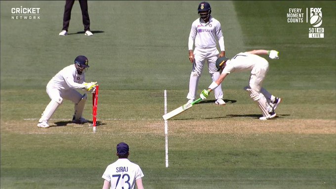 मैच की पहली पारी के 55वें ओवर में ऑस्ट्रेलियाई बल्लेबाज कैमरून ग्रीन शॉट खेलकर रन के लिए दौड़े थे। ग्रीन ने पहले मना किया, फिर रन के लिए आगे बढ़ गए। इसके बाद नॉन स्ट्राइक पर खड़े कप्तान टिम पेन भी रन के लिए दौड़ पड़े। तभी बॉल विकेटकीपर ऋषभ पंत के हाथ में पहुंची। उन्होंने बिना देर किए हुए स्टंप्स बिखेर दिए। टीवी रिप्ले में साफ नजर आया कि पेन का बैट क्रीज के ऊपर था।