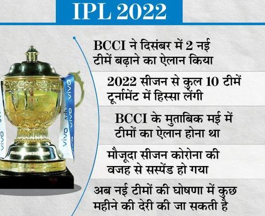 इससे पहले BCCI के एक अधिकारी ने मार्च में कहा था कि मई में 14वें सीजन के बीच में नई टीमों पर फैसला लिया जाएगा। बोर्ड ने कहा था कि नीलामी से लेकर टीम फाइनल करने तक की पूरी प्रक्रिया मई में हो जाएगी। एक बार टीम फाइनल होने के बाद वे टीम बनाने को लेकर काम शुरू कर सकते हैं। अब ये सारी प्रक्रिया आगे बढ़ सकती है।