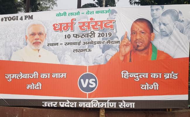 लखनऊ | उत्तरप्रदेश की राजधानी में सुबह सुबह कुछ होर्डिंग चर्चा का विषय बन गये | जब पुलिस को इस बात की सुचना मिली तो पुलिस ने उन होर्डिंग को हटवाकर अपने कब्जे में ले लिया हैं बताया जा रहा हैं की ये होर्डिंग उत्तरप्रदेश सरकार के मुख्यमंत्री योगी आदित्यनाथ और नरेन्द्र मोदी के हैं जिन पर योगी फॉर पीएम लिखा है हैं मोदी की फोटो के नीचे जुमलेबाजी का नाम मोदी और योगी आदित्यनाथ के फोटो के नीचे हिंदुत्व का ब्रांड योगी. लिखा हुआ हैं |राजधानी में 2-3 स्थानों पर ये होर्डिंग रात में लगाए गए हैं. ये पोस्टर फरवरी को होने वाली धर्म संसद का जिक्र है. एक तरफ पीएम मोदी की तस्वीर है, तो दूसरी तरफ योगी की लगी है ये हॉर्डिंग उत्तर प्रदेश नमनिर्माण सेना की और से लगाए गए हैं. पुलिस ने इस मामले में संज्ञान लिया है. इस संबंध में मुकदमा दर्ज कर लिया गया है. पुलिस मामले की छानबीन कर रही है. यूं तो पोस्टर देखने से यह किसी की शरारत लगती थी, लेकिन साफ हो गया कि पोस्टर लगाने वाला कोई और नहीं बल्कि अमित जानी है.जैसे ही तीनों राज्यों के नतीजे आए हैं वैसे ही यह पोस्टर लखनऊ के मुख्य चौराहे पर नजर आने लगे इसमें यह शरारत दिखी कि प्रधानमंत्री मोदी को कमतर दिखाया जाए जबकि योगी आदित्यनाथ को हिंदुत्व का बड़ा चेहरा. जैसे ही पोस्टर लोगों की नजरों में आया सरकार सक्रिय हो गई. हजरतगंज थाने में एफआईआर दर्ज कराई गई | हालांकि बीजेपी से उनका कोई सीधा वास्ता नहीं है,
